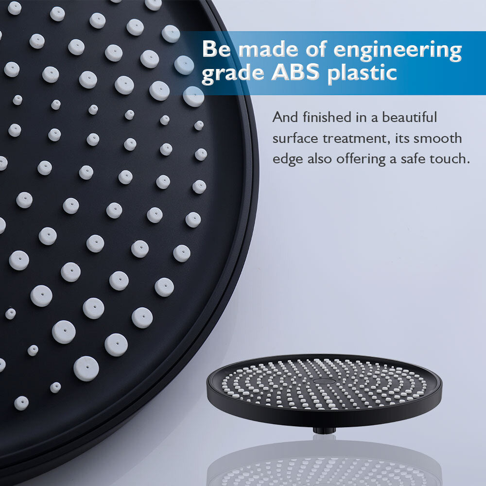 Rain Shower Head Info: 10" (254mm) ABS round overhead Rainfall shower Easy cleaning rubber jets with improved hydrodynamic resistance 360° swivel ball joint adjustable in all directions Mesh filter inside the shower head, blocks all debris in water