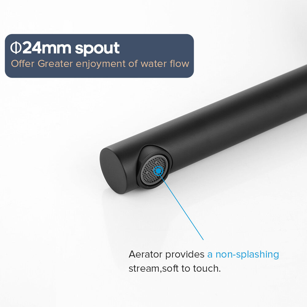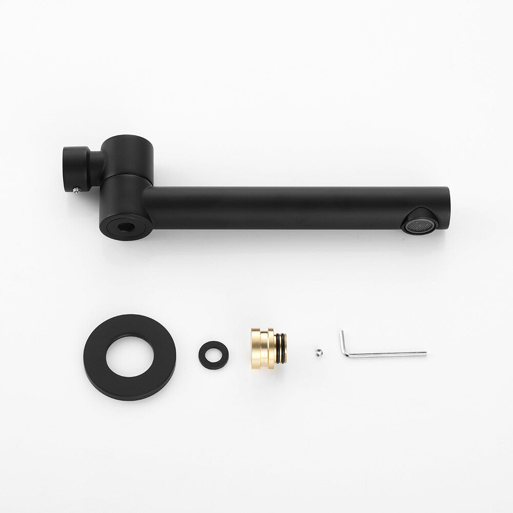Bath Spout: Constructed from brass and boasting a matte black finish, this bath spout is both durable and stylish. It comes with two types of nozzles. The one for the washbasin emits a gentle, soothing flow of water, perfect for daily handwashing and face cleansing. The other, designed for the bathtub, ensures a rapid water flow, filling your tub quickly for a relaxing soak.