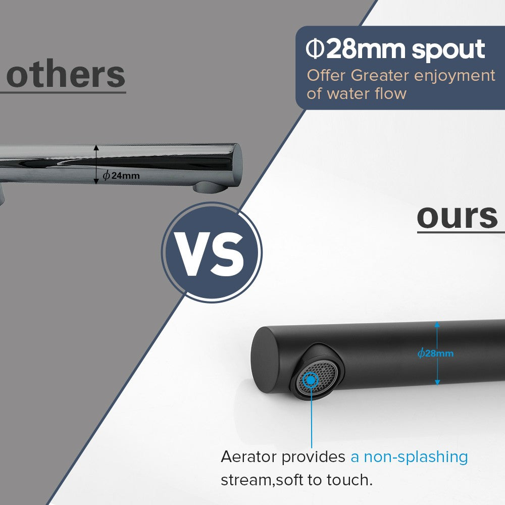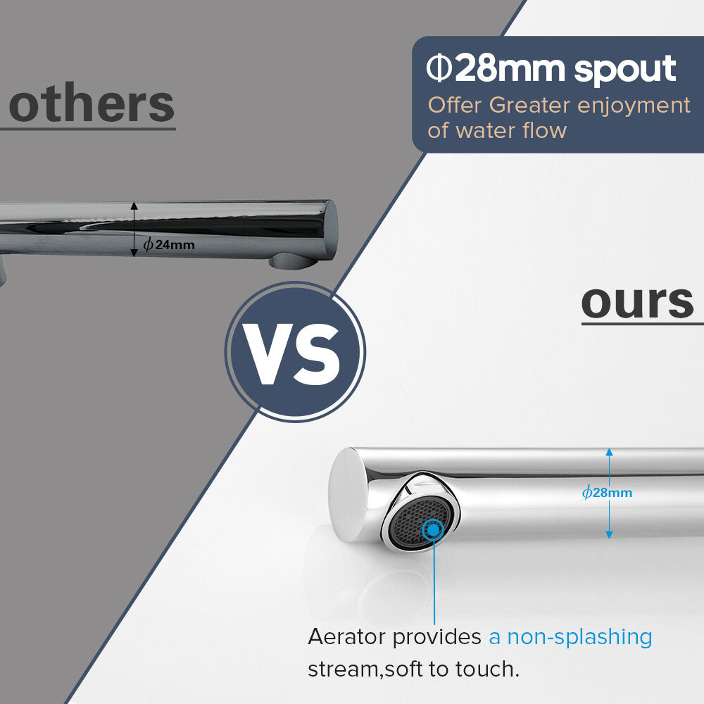 > 180° swivel to meet your demand of any positions and to save the space of your bathroom > The pipe diameter is 28mm, and Spout diameter is 24mm,which offer greater enjoyment of larger water flow: can shortens the time for filling the bathtub with water. > Aerator provides a non- splashing stream,soft to touch. > Extensive use in bathtub / vanity, also could be mounted as wall basin mixer taps > Easy installation, just remove old taps or spout and fit straight in. No additional major plumbing work needed