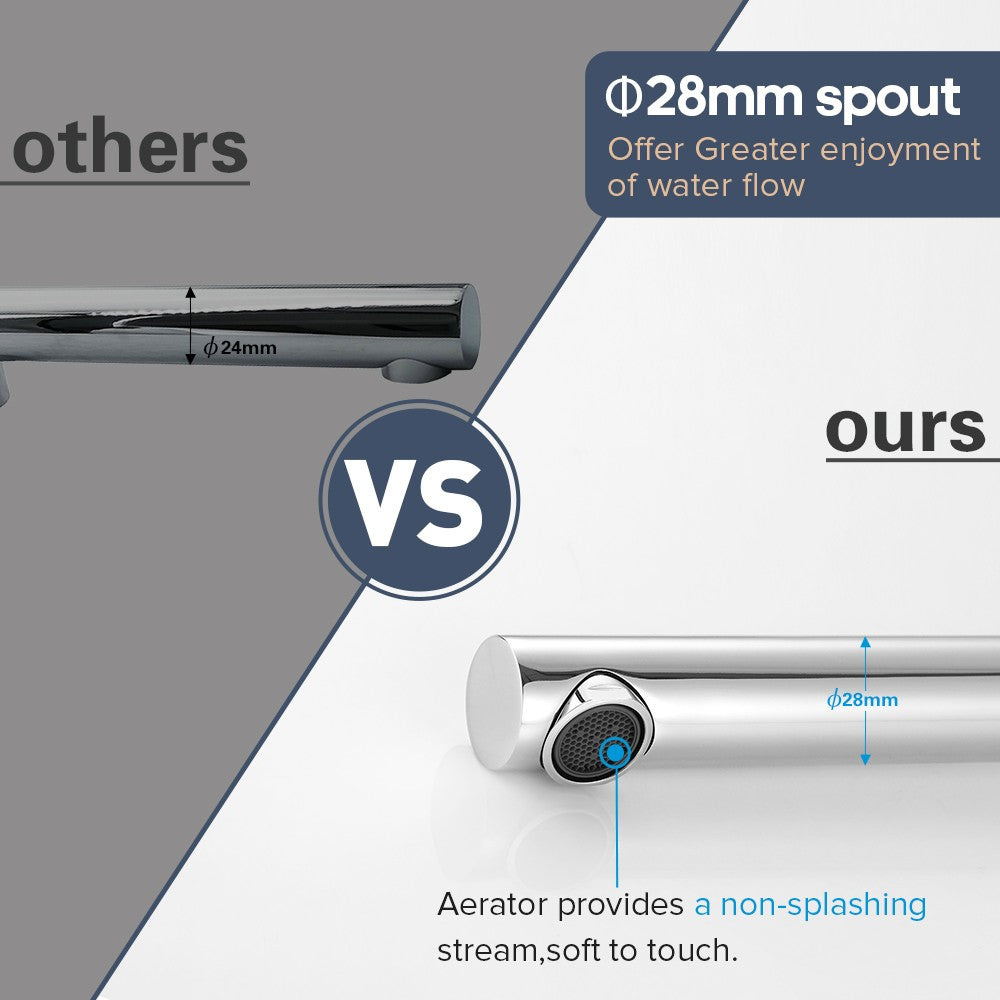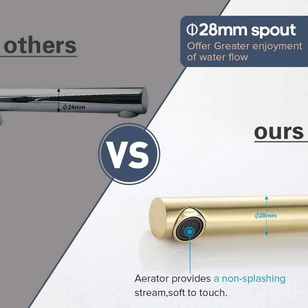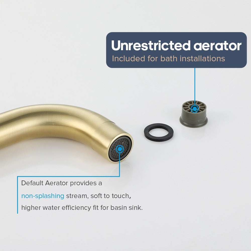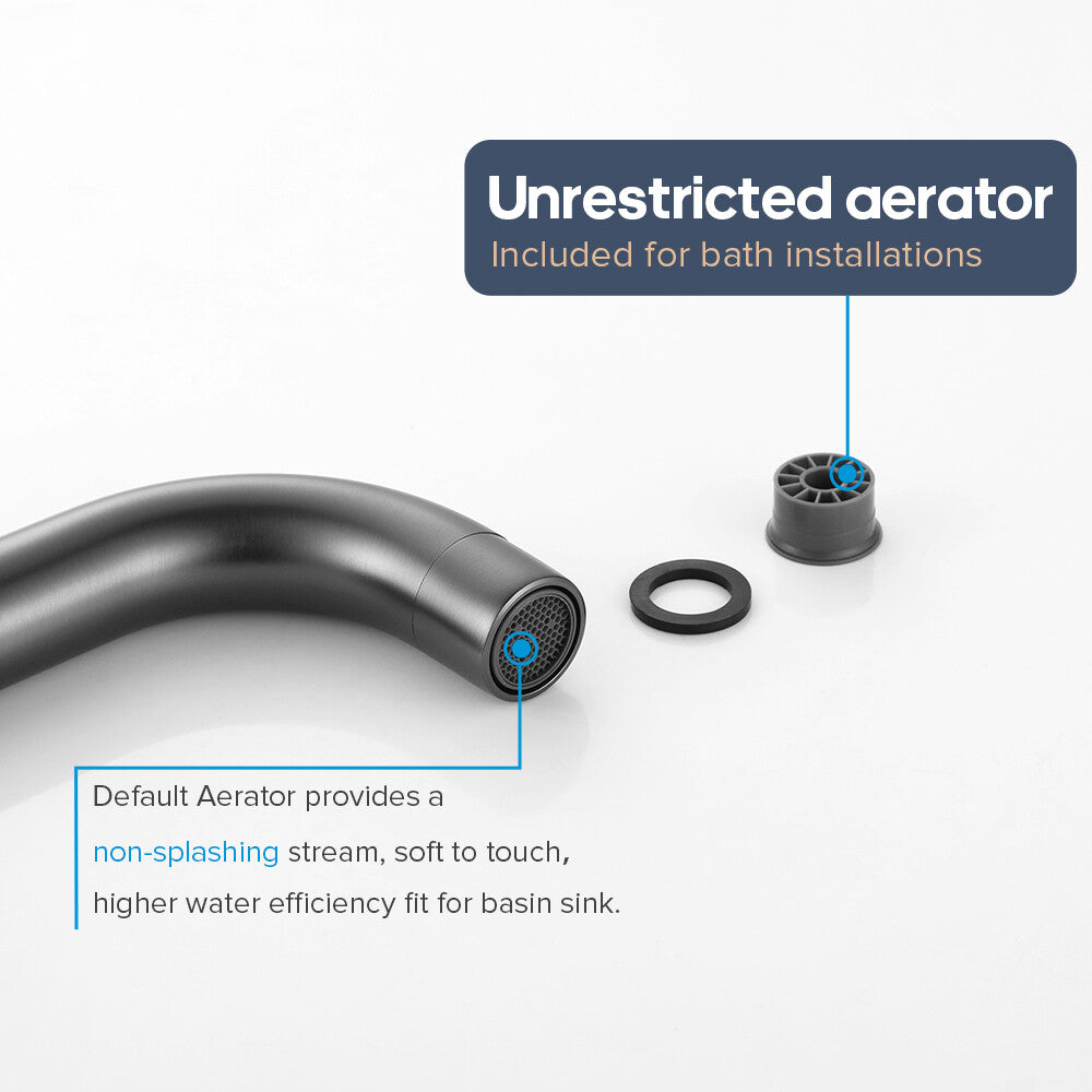 Single Spout: > Solid brass material guarantees long service life > Default aerator provides a non-splanshing steam,soft to touch,higher water efficiency fit for basin sink > Unrestricted aerator for bath installation, provide Large water flow > Fit both for Basin Sink and Bath tub