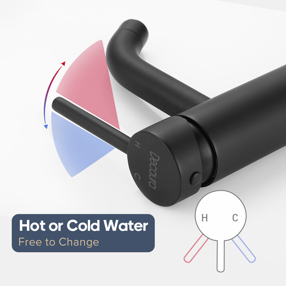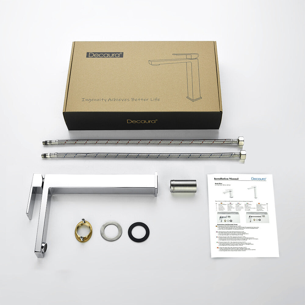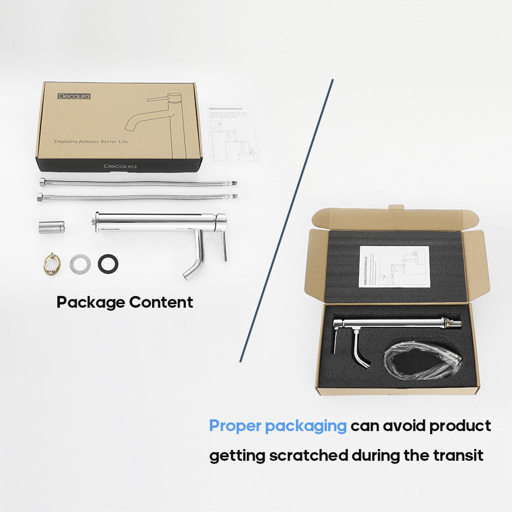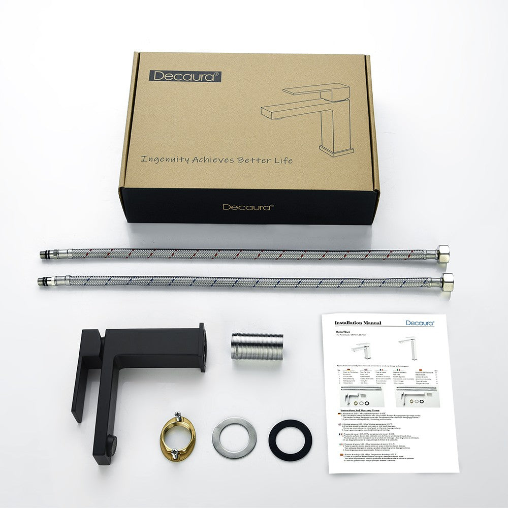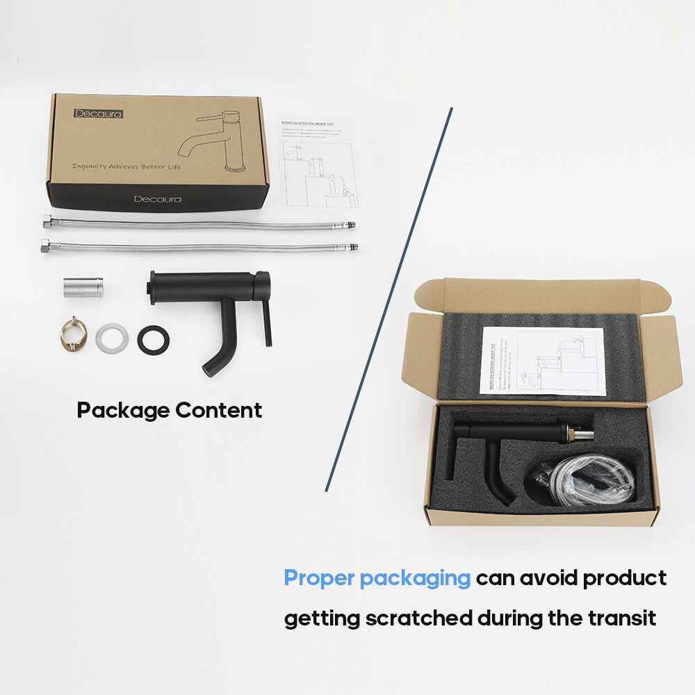 Item Type: with pull out spray in chrome/matte black Main features: (2) 2 Mode Spray: Stream mode non- splashing and water-saving. Jet mode reach use for washing hair, basin corner or bathing pets. (3) Health and durable: Lead-free brass construction, 500,000 life time completed ceramic spool provides sensitive control water and temperature. Odorless by using PEX inner hose. (4) Easy to Install: An installation video help you to fix by yourself smoothly. This bathroom sink tap is suitable for mounting hole diameter of 32-45mm, 60cm long hoses make connection easier. (5) Quality Assurance: 100% test before packing, Decaura's tailor-made sponge packaging well protect the tap during the transportation. 24/7 customer service, so you have no worries. Package contents |