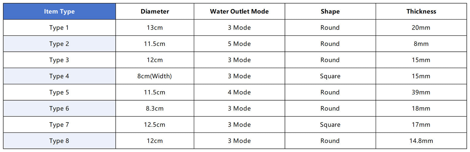 4 Modes Spray:Massage/Bubble/Rainfall/all three spray (there is also a mode for water stop)