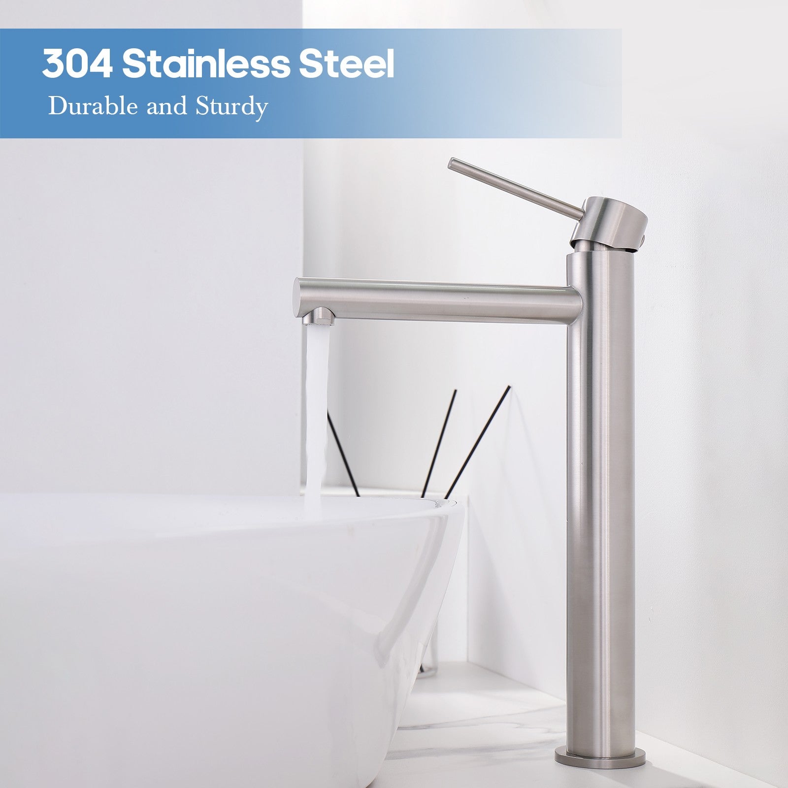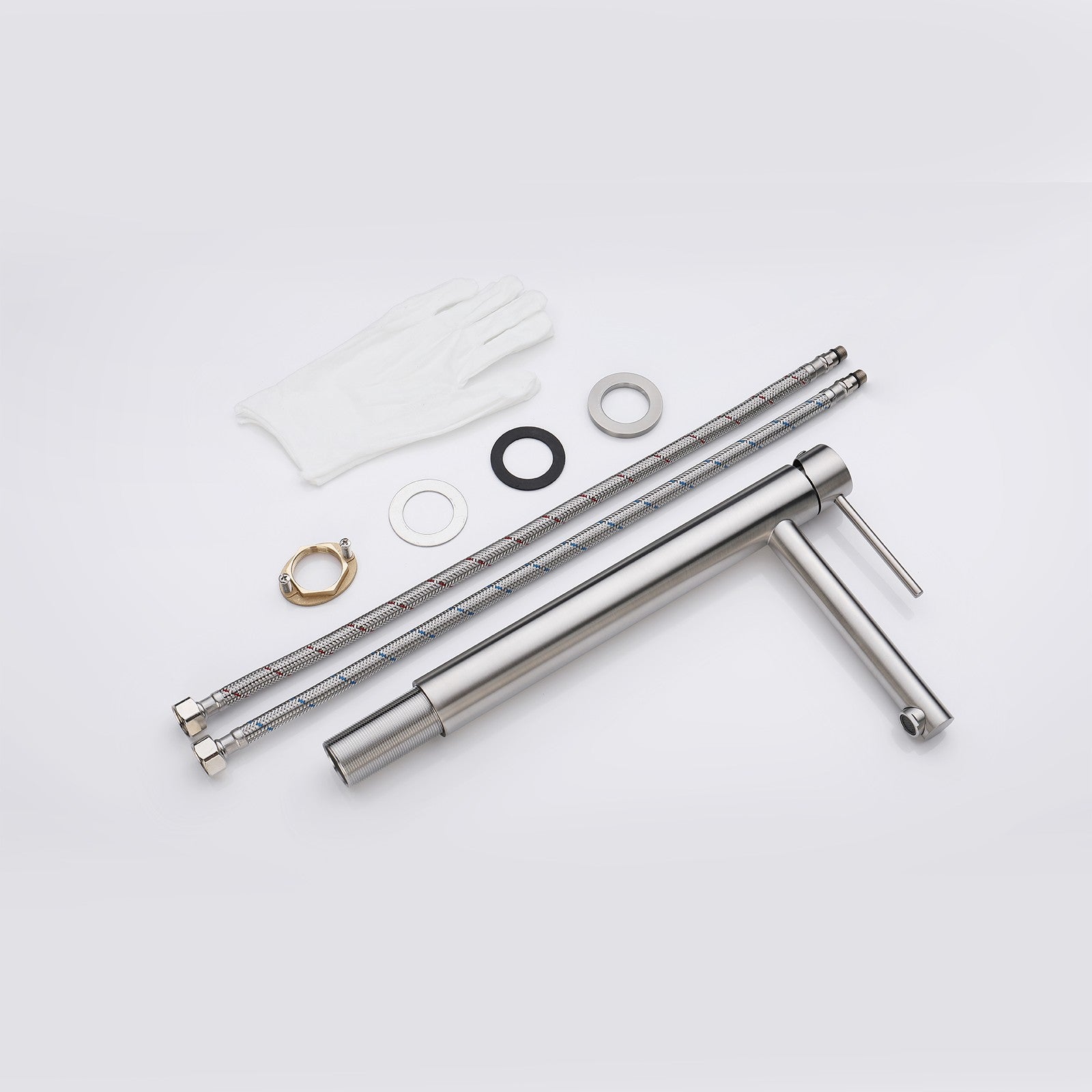 1 x Basin mixer tap. Sturdy Stainless Steel Build : The Tall bathroom mixer tap body is crafted from stainless steel, ensuring exceptional durability and long-lasting performance. Ideal for Above-Counter Basins : This basin tap is perfectly suited for installation alongside above-counter basins, with a total height of 307mm and a spout-to-counter distance of 237.5mm.